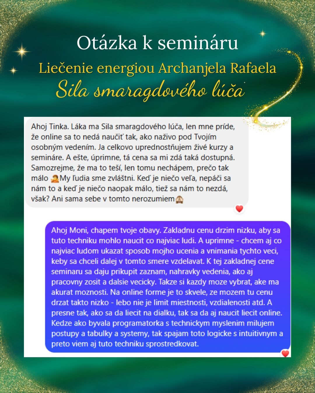 „Láka ma Sila smaragdového lúča, len mne príde, že online sa to nedá naučiť tak, ako naživo pod Tvojím osobným vedením. Ja celkovo uprednostňujem živé kurzy a semináre. A ešte – úprimne – tá cena sa mi zdá taká dostupná. Samozrejme, že ma to teší, len tomu nerozumiem, prečo tak málo. My ľudia sme zvláštni. Keď je niečo veľa, nepáči sa nám to a keď je niečo naopak málo, tiež sa nám to nezdá, však? Ani sama sebe v tomto nerozumiem.“